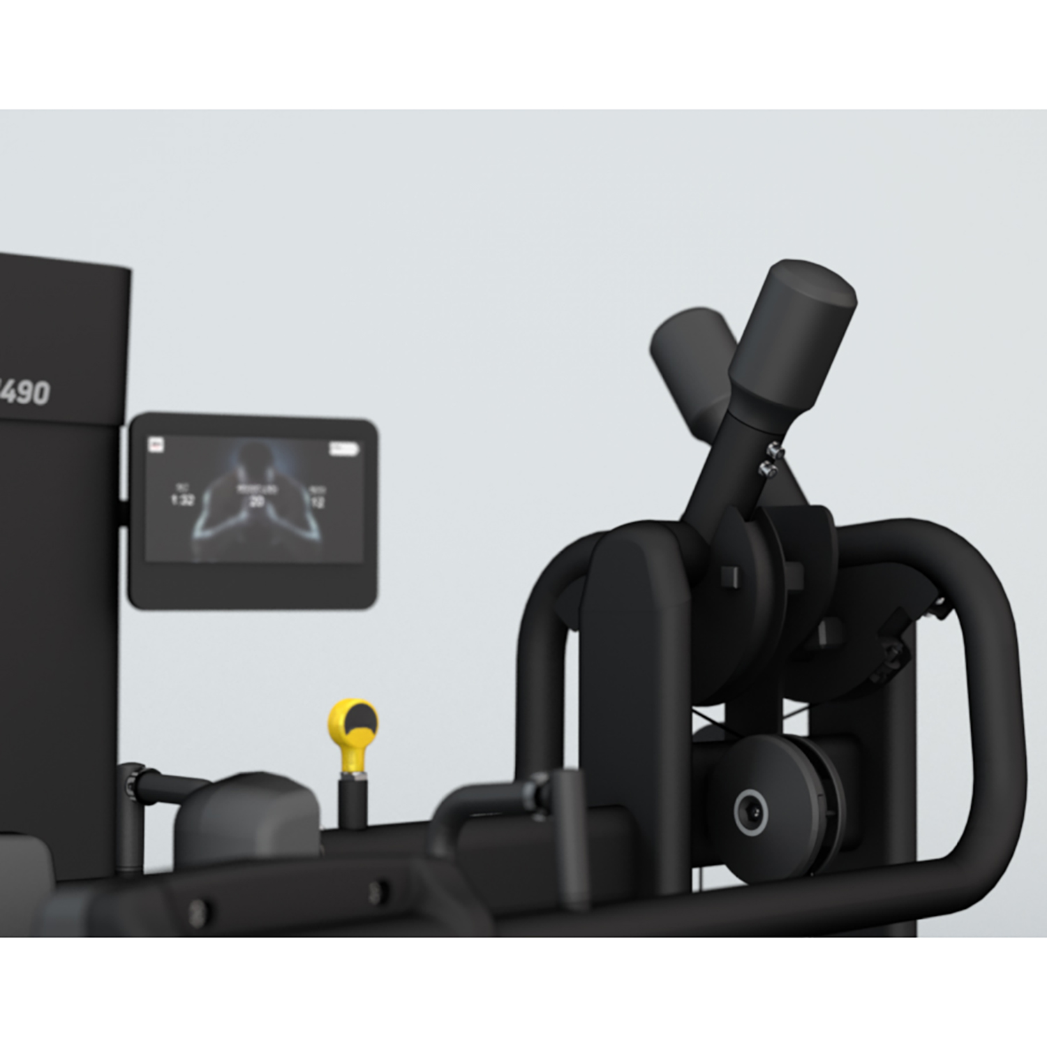 M490 deltoid raise er med arme der bevæger sig uafhængigt af hinanden, og i convergent bevægelse. Begge arme er monteret med modvægt som neutralisere armenes vægt. De gummibelagte håndtag er med antibakteriel overflade, som sikre optimalt greb. Den komfortable brystpude, samt skulderpuder er også med antibakteriel overflade. Både brystpude og sæde justeres let med kliklås.