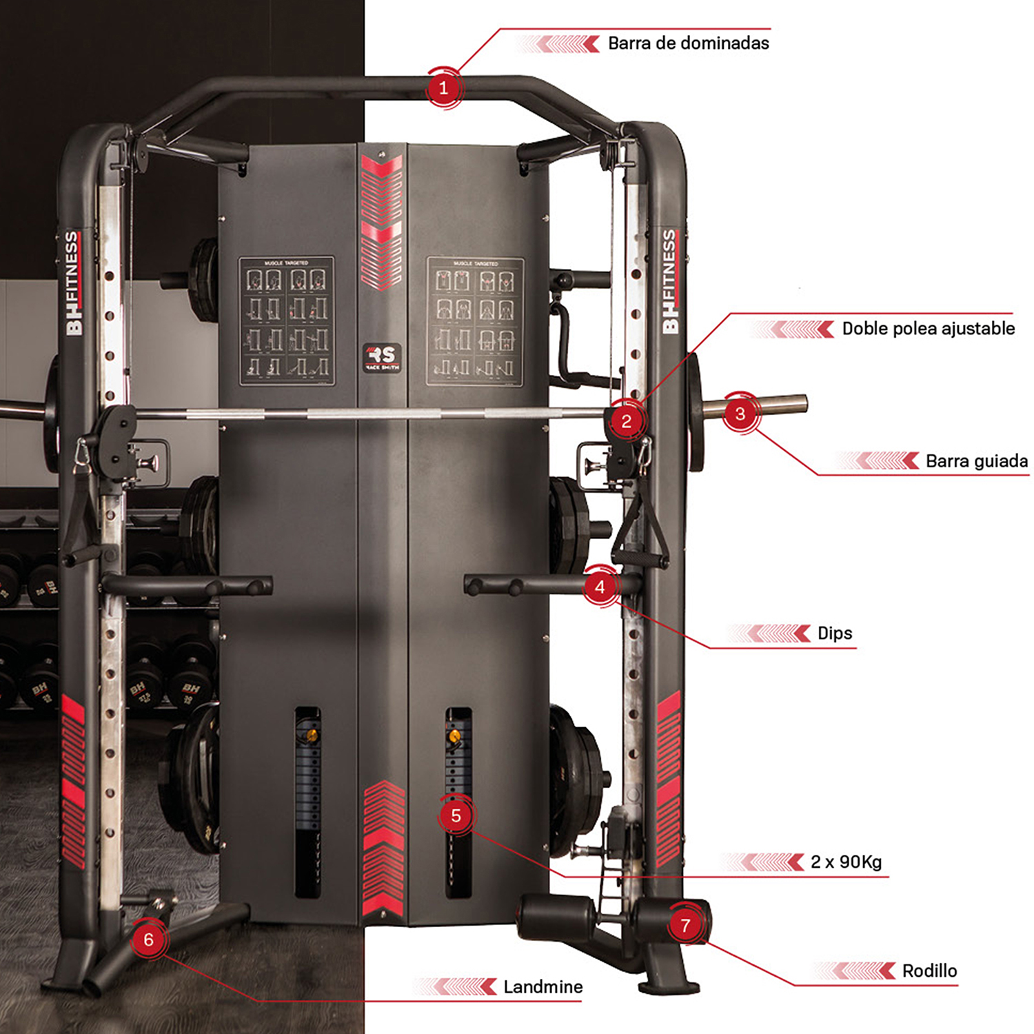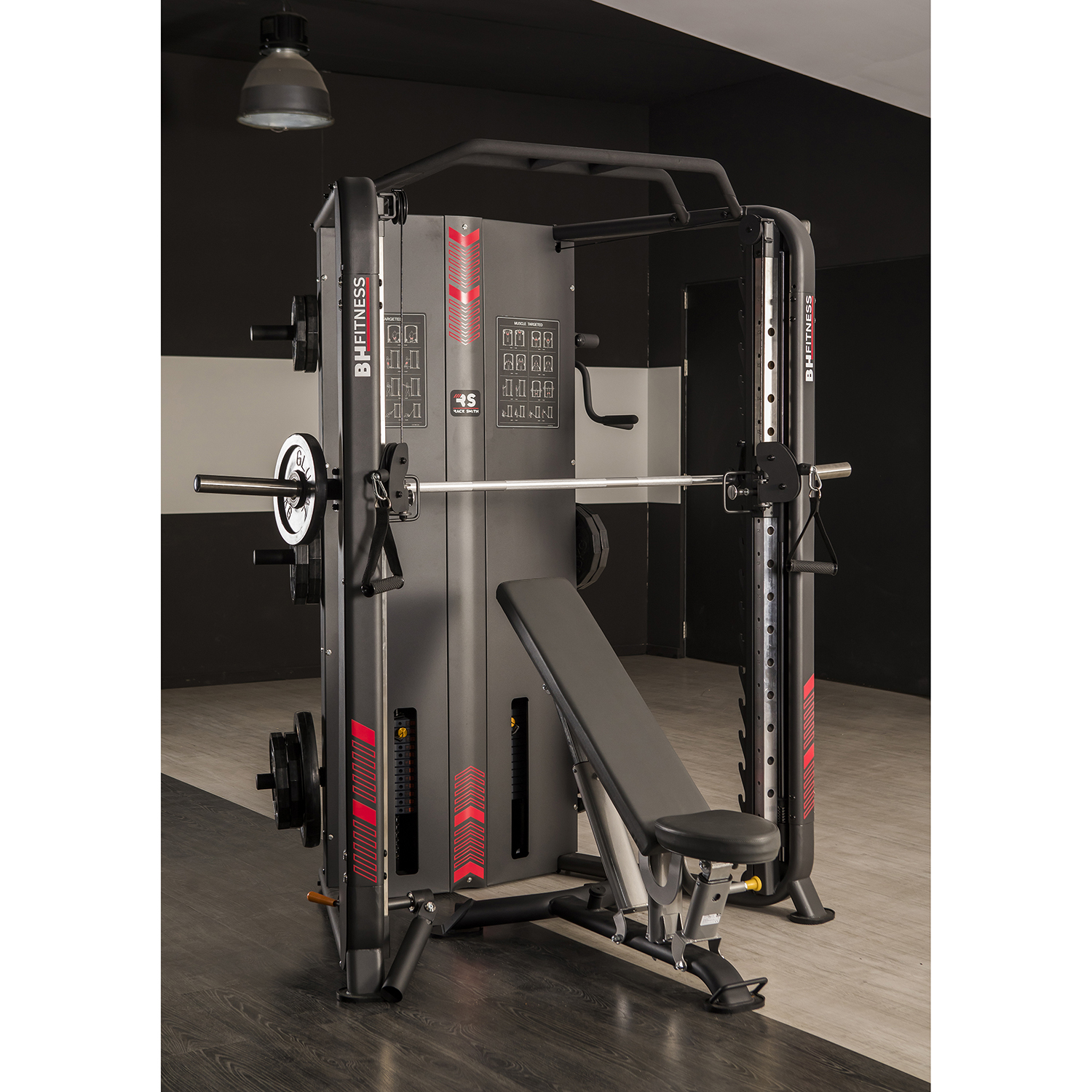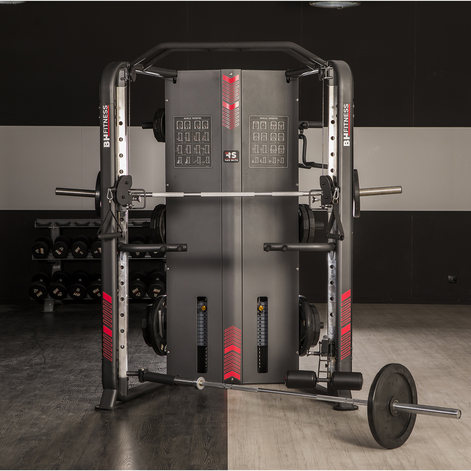 G160 er fra BH Fitness nye serie af semi-professionelle maskiner. Den kraftige konstruktion giver sammen med det flotte design, et udtryk af virkelig robust og lækker kvalitet. Maskinen er gearet til både firmaet, hoteller og mindre motionscentre. De to tårne er med hver 90 kg., og med det justerbare trækpunkt i begge tårne, kan der laves et utal af øvelser. Både i hvert tårn for sig, så to personer kan træne samtidig, eller de to tårne sammen. Trækpunktet justeres let med én hånd, og kan indstilles i 17 forskellige højder, hvilket også gør G160 velegnet til genoptræning. Alle hjul er med kraftige kuglelejer, og i alle bevægelige led er monteret stålbøsninger. Derudover tilbyder G160 med smithracket også sikker træning med vægtstang. De stærke foringer som stangen kører i giver en let glidende bevægelse, og de kraftige kroge sikrer at vægtstangen griber godt fast når den vippes på plads. I hver side kan sikkerhedsstænger indstilles i den ønskede højde, og vægtstangen kan aldrig falde længere, end sikkerhedsstængerne er placeret. Så her kan der trænes 100% sikkert selvom man træner alene. På tværvangen er monteret håndtag til kropshævninger, og maskinen har også en landmine til fri vægtstang. G160 er ideel til både alm. styrketræning og til genoptræning. Det viste tilbehør medfølger, dog ikke vægtskiver.