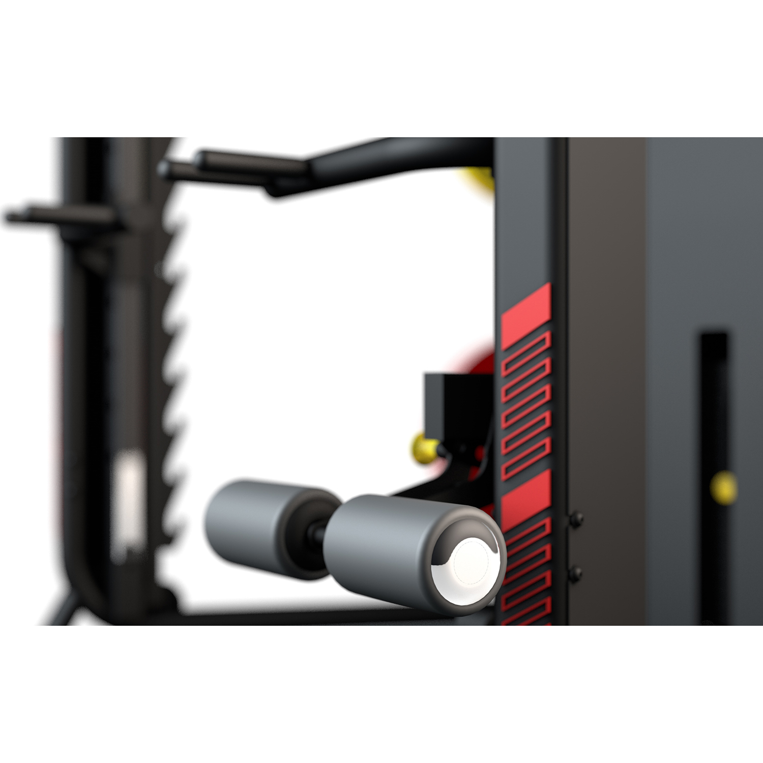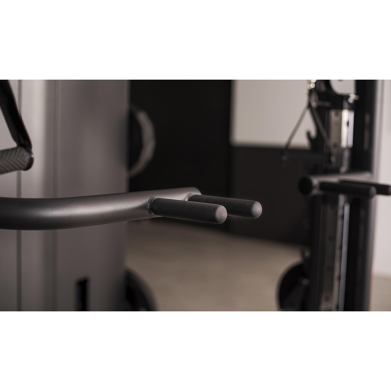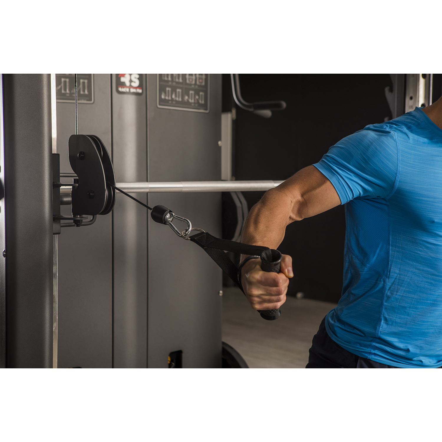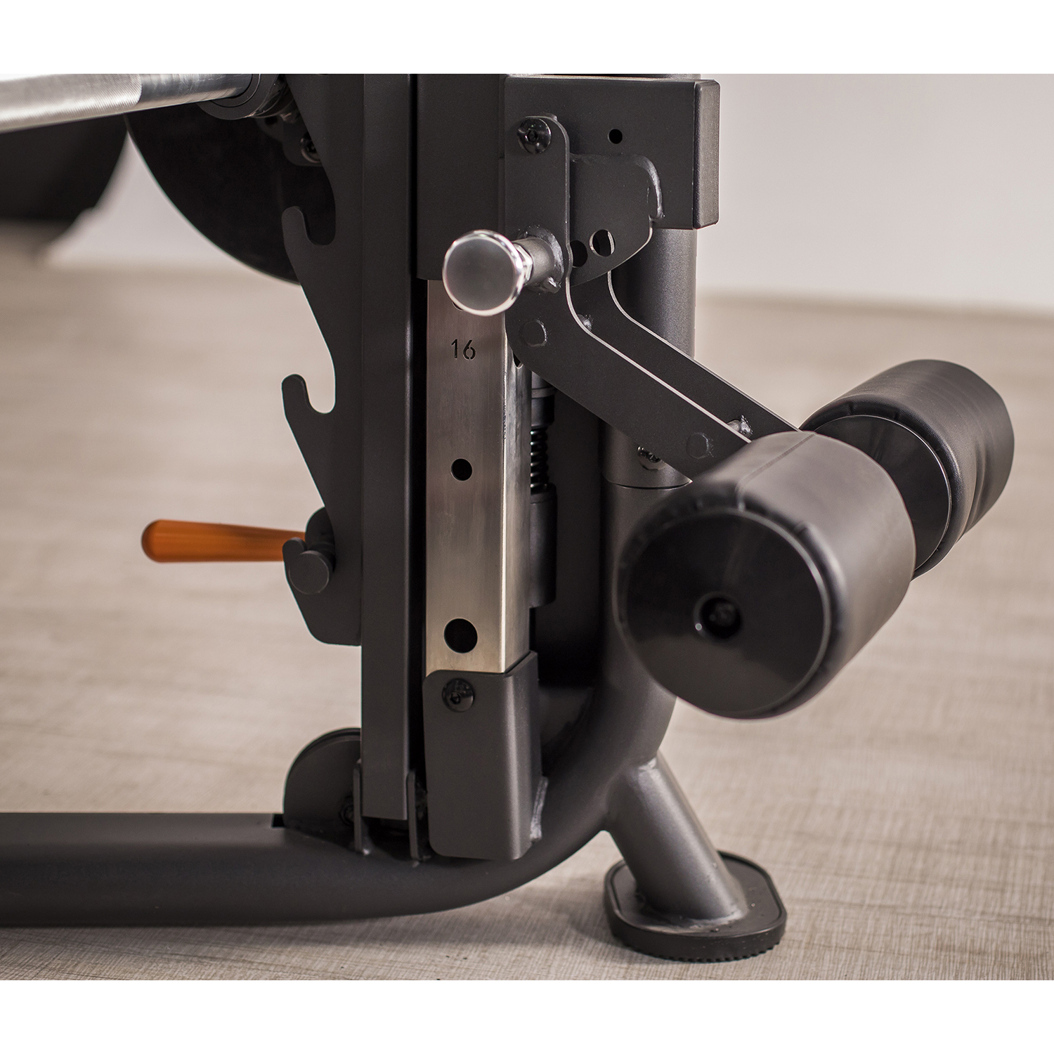 G160 er fra BH Fitness nye serie af semi-professionelle maskiner. Den kraftige konstruktion giver sammen med det flotte design, et udtryk af virkelig robust og lækker kvalitet. Maskinen er gearet til både firmaet, hoteller og mindre motionscentre. De to tårne er med hver 90 kg., og med det justerbare trækpunkt i begge tårne, kan der laves et utal af øvelser. Både i hvert tårn for sig, så to personer kan træne samtidig, eller de to tårne sammen. Trækpunktet justeres let med én hånd, og kan indstilles i 17 forskellige højder, hvilket også gør G160 velegnet til genoptræning. Alle hjul er med kraftige kuglelejer, og i alle bevægelige led er monteret stålbøsninger. Derudover tilbyder G160 med smithracket også sikker træning med vægtstang. De stærke foringer som stangen kører i giver en let glidende bevægelse, og de kraftige kroge sikrer at vægtstangen griber godt fast når den vippes på plads. I hver side kan sikkerhedsstænger indstilles i den ønskede højde, og vægtstangen kan aldrig falde længere, end sikkerhedsstængerne er placeret. Så her kan der trænes 100% sikkert selvom man træner alene. På tværvangen er monteret håndtag til kropshævninger, og maskinen har også en landmine til fri vægtstang. G160 er ideel til både alm. styrketræning og til genoptræning. Det viste tilbehør medfølger, dog ikke vægtskiver.