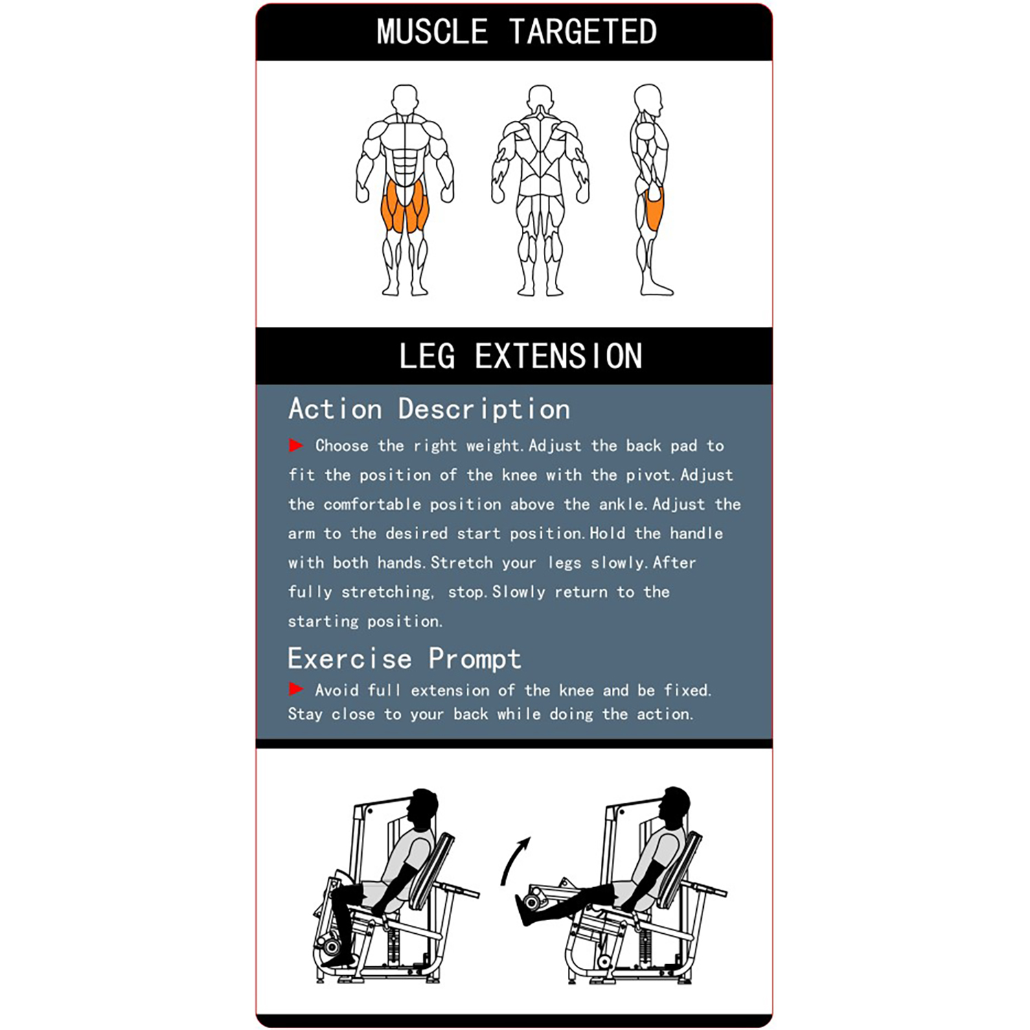 Maskinen er med let højdejustering af benpuder for ønsket startposition. Ryglænet justeres let med kliklås, så afstanden passer med benlængden. Håndtag er med behagelig og antibakteriel belægning, som også er let at aftørre. Vægtbelastning kan indstilles mens man sidder på maskinen.