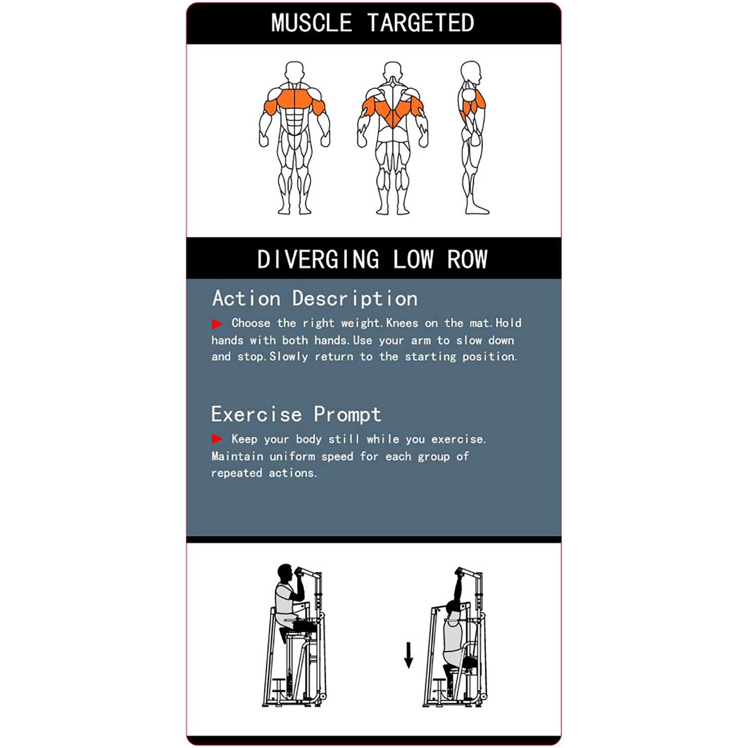 Alle justeringsmuligheder er tydeligt vist med gul markering, så det er let for brugerne at se hvor der kan justeres, og vægtmagasinet er med magnetisk magasinsplit der ikke falder ud under brug. På alle magasinmaskiner vises start og slutposition samt hvilke muskelgrupper der trænes.