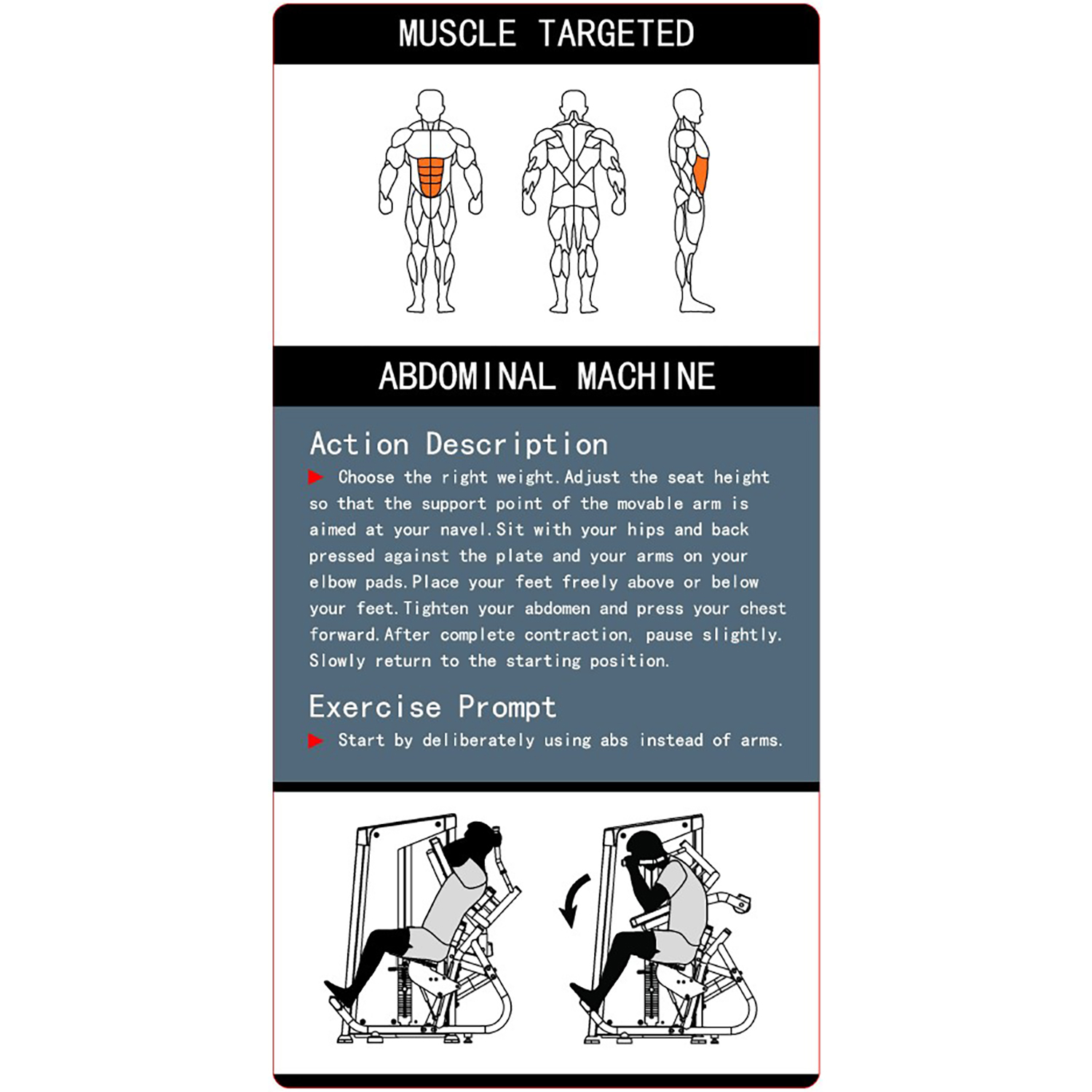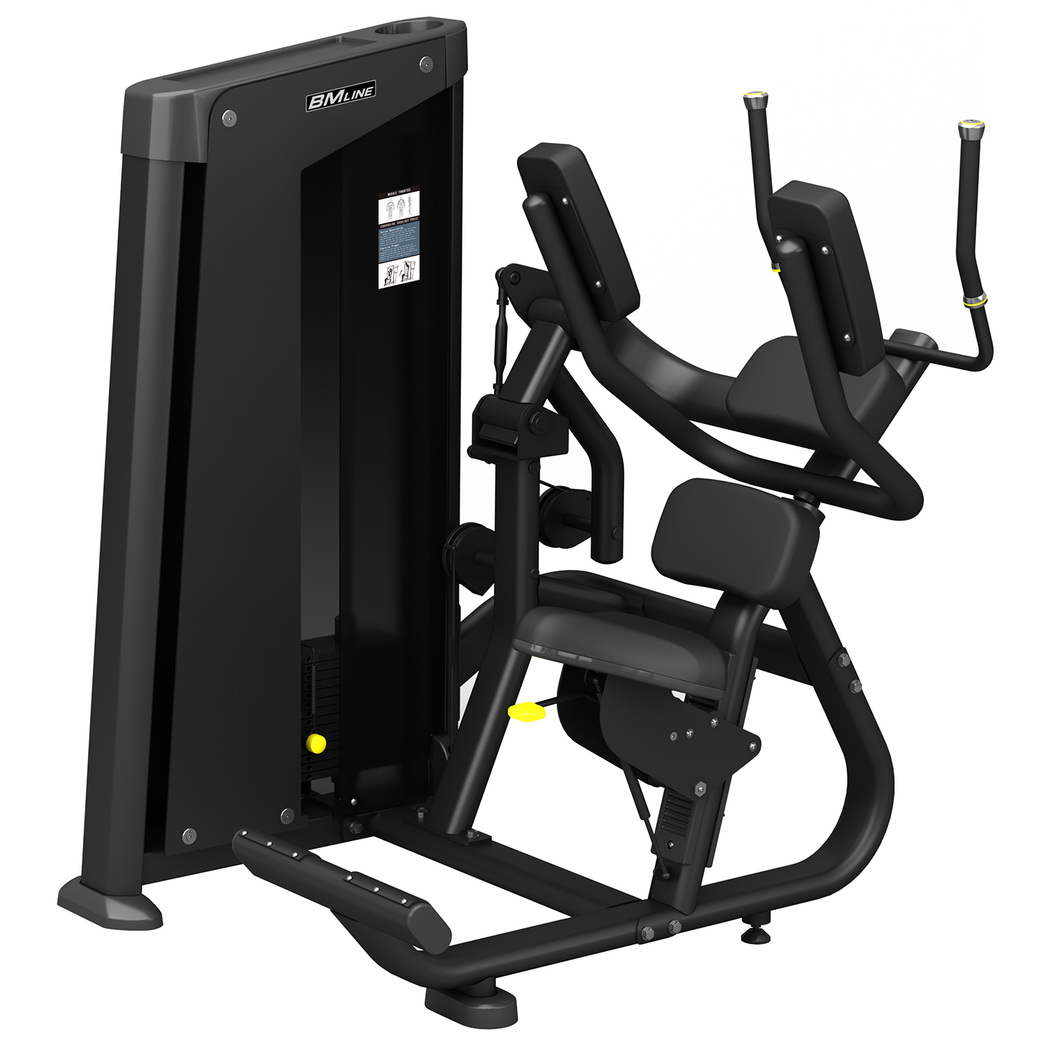 Her trænes mavemuskler uden at belaste lænden. Sædehøjden indstilles let med olietryk, og under øvelsen giver de to armpuder god støtte. Håndtag er med behagelig og antibakteriel belægning, som også er let at aftørre. Vægtbelastning kan indstilles mens man sidder på maskinen.