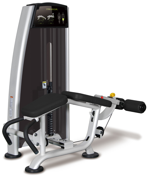 Liggende baglårsmaskine træner bagsiden af lår. Maskinen er bl.a. med markeringsmærke der viser korrekt