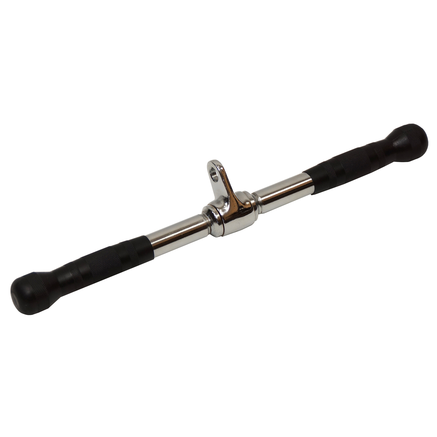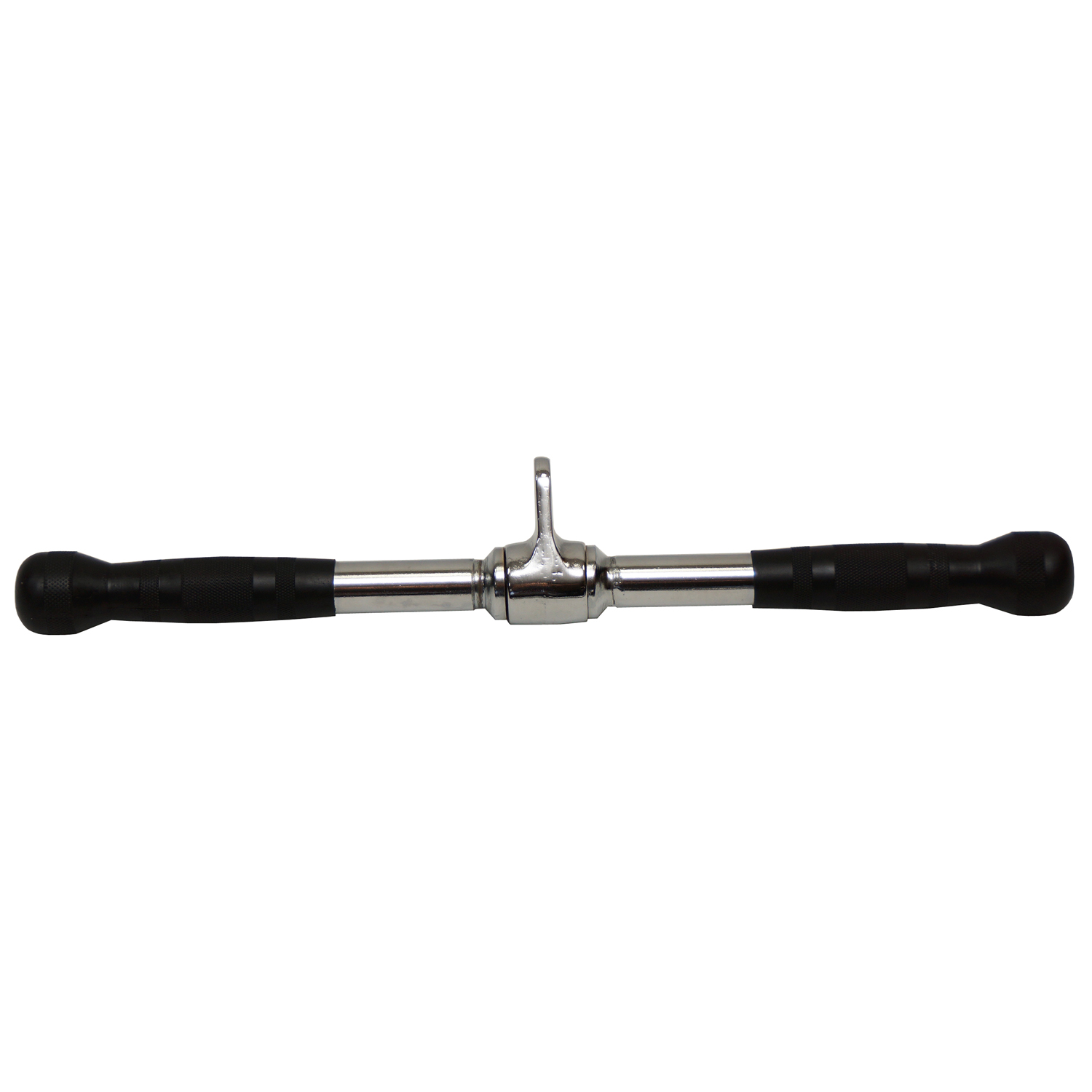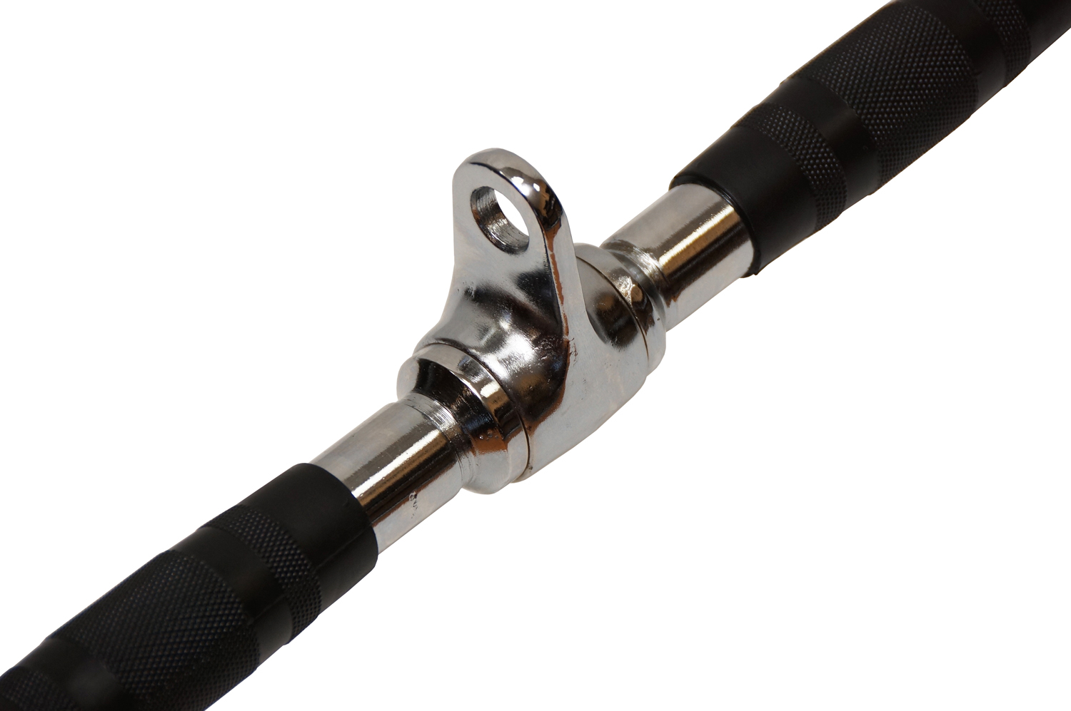 Massiv krombelagt triceps-stang, med gummibelagte håndtag der sikre et virkeligt godt greb samt ekstra komfort. Stangen er med drejbart øje til karabinhage.