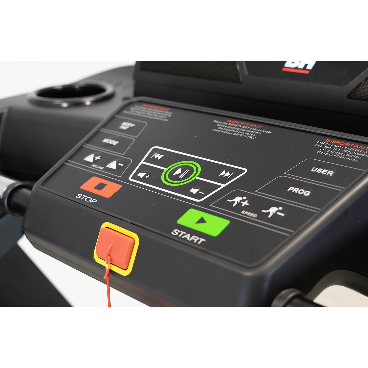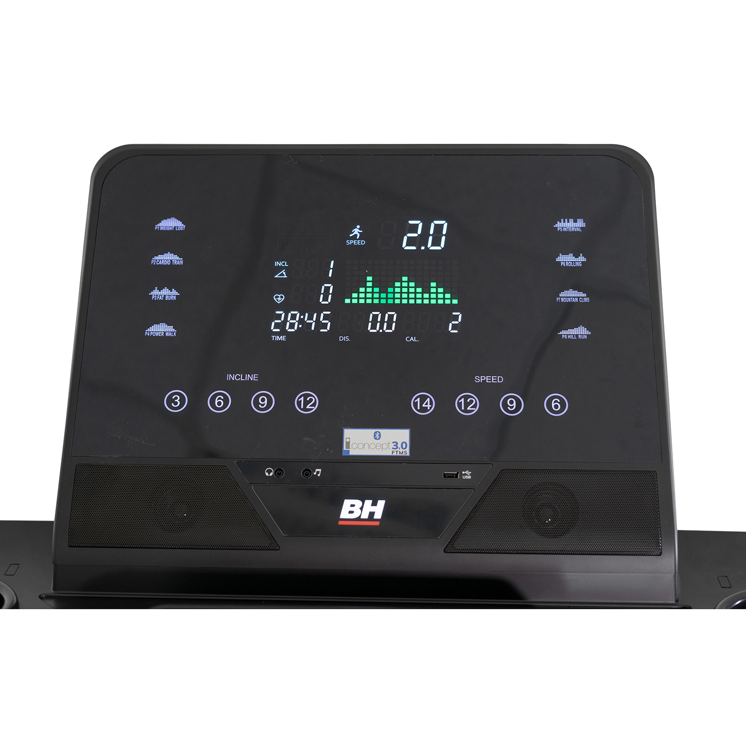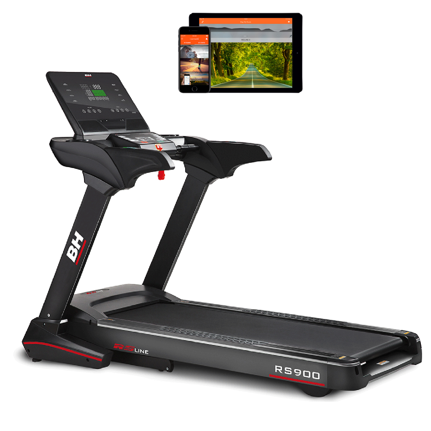 Løbebåndet RS900 er i den nye og flotte RS serie fra BH Fitness. Ønsker du et løbebånd i flot og elegant design, og med virkelig god komfort, vil RS900 være en seriøs kandidat. Motoren der yder 2,5 HP., (peak effekt på 4 HP.), giver uden problemer topfarten på 22 km/t., og RS900 er desuden udstyret med en stærk hæve-/sænke motor, som sørger for hældning på op til 15%. Løbefladen er på 55 x 150 cm., og har det patenterede SDS stødabsorbering system, for ekstra aflastning af led. Trædepanelerne på hver side af bæltet er med en skridsikker belægning. De tværgående pulshåndtag sikrer let adgang til at få vist puls, og RS900 er selvfølgelig også kompatibelt med trådløst pulsbælte. På tastaturet mellem pulshåndtag kan der reguleres både hastighed og hældning, og det kan også reguleres på de to sidehåndtag. - Så man efter start ikke behøver at trykke på computerkonsollet. Computeren indeholder naturligvis de programmer der forventes, og er samtidig med FTMS bluetooth, som gør RS900 kompatibel med et bredt udvalg af App´s, heriblandt Kinomap og Zwift.