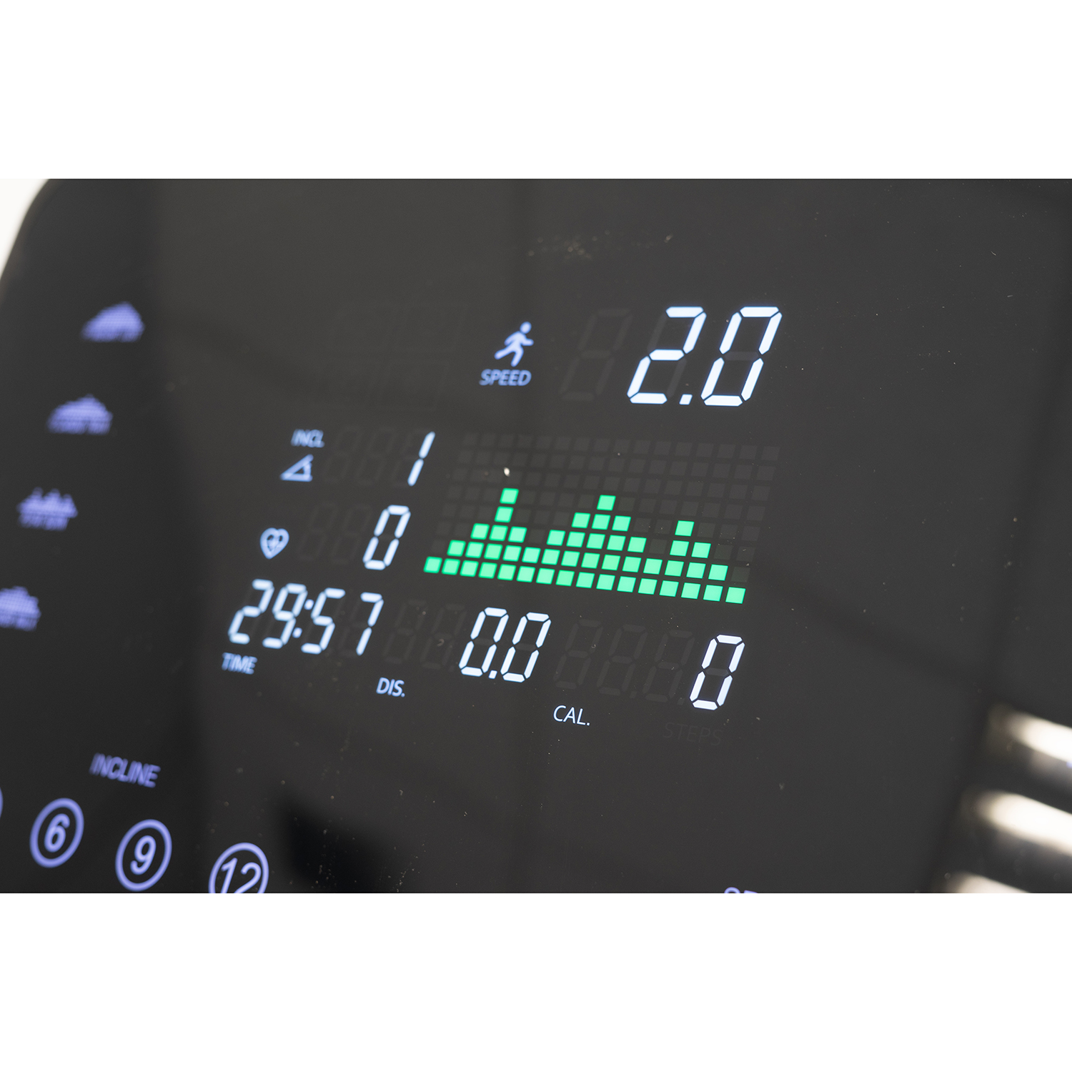 - Visning i display: Program forløb, tid, distance, kalorier, hastighed, puls,